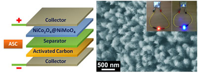 10. We report a novel electrode of 3D hierarchical Co3O4@NiMoO4 flower-like hybrid arrays synthesized with the combination of hydrothermal and post-annealing treatment. The Co3O4 nanowire arrays are utilized as scaffolds and interconnected NiMoO4 nanosheets are grown on the surface. The assembled hybrid supercapacitor device based on Co3O4@NiMoO4 and AC as the positive and negative electrodes can achieve a high energy density of 58.5 Wh/kg at 389 W/kg, suggesting the great potential for applications in supercapacitors.